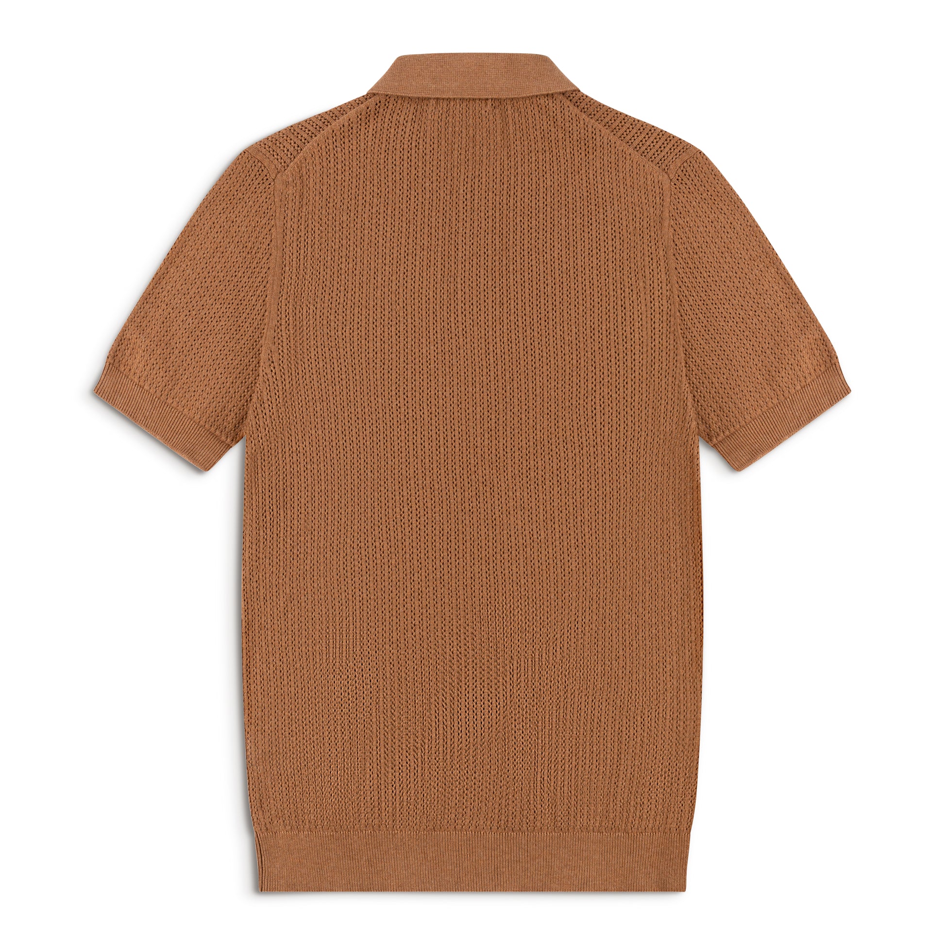 Elevate your everyday wardrobe with this caramel brown textured knit polo. Designed with a breathable vertical knit structure, this piece offers refined texture while maintaining a clean, timeless silhouette.